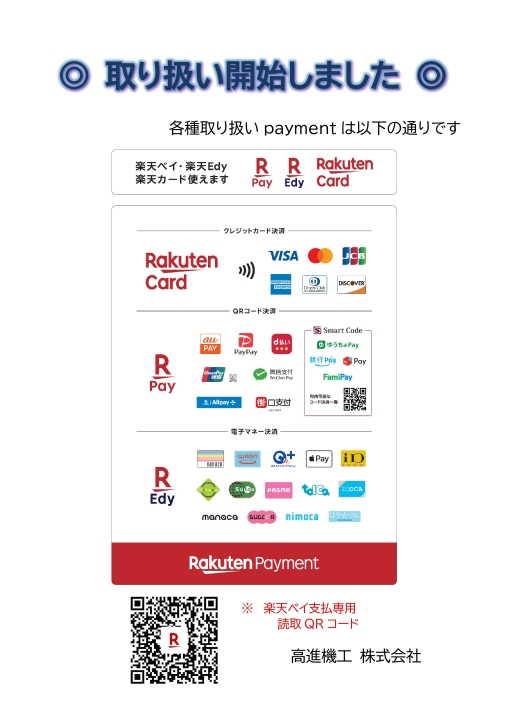 現金、銀行口座振込のほか各種クレジット決済、QRコード決済、電子マネー決済の取り扱いがあります。